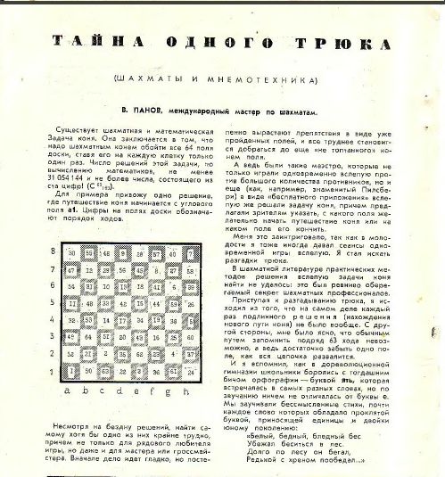 Где-то на рубеже конца 60-х начала 70-х годов прошлого уже века встретил в очень авторитетном журнале «Наука и жизнь» статью мастера Василия Панова, исследователя творчества Чигорина, Капабланки и Алехина, о трюке с ходом коня.